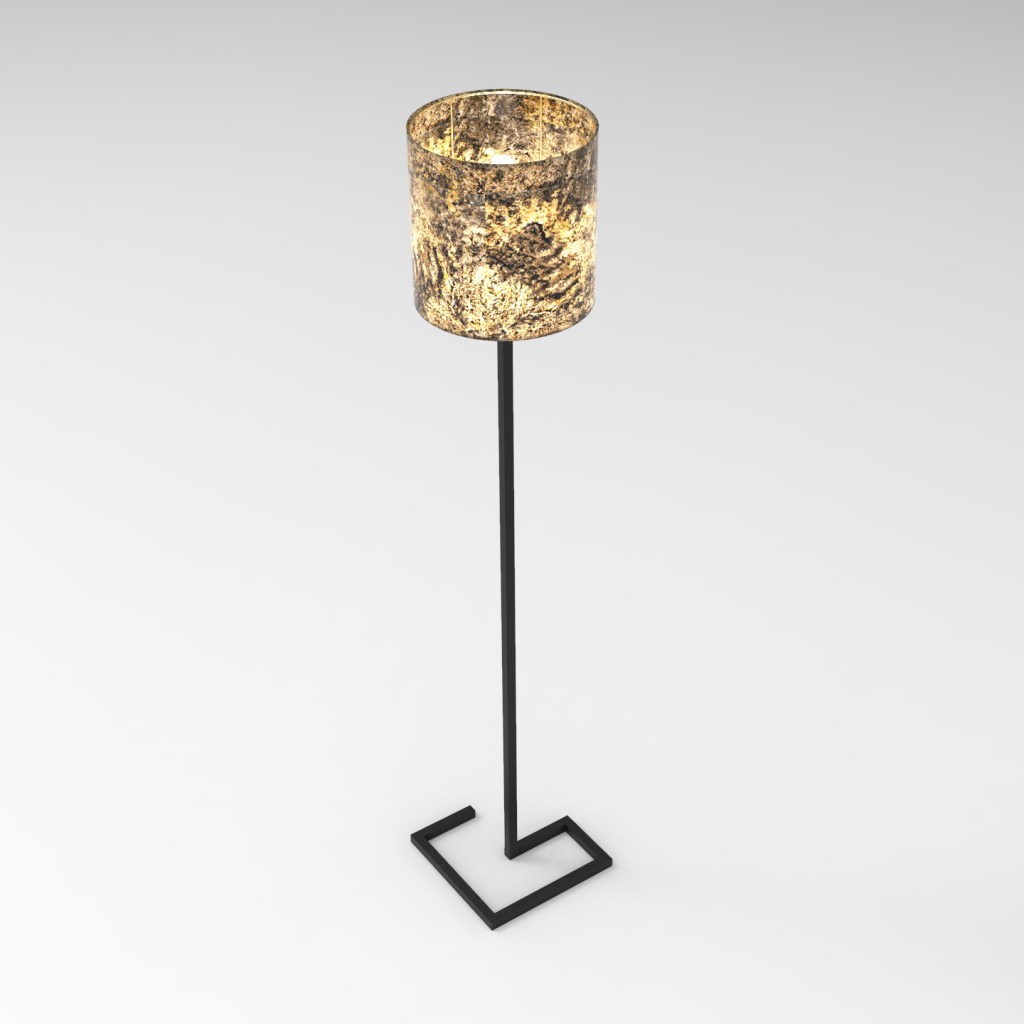 Ce lampadaire moderne est équipé d’un abat-jour cylindrique unique en feuille de pierre translucide, de type ardoise aux passages crèmes et or, qui diffuse une lumière douce et texturée. Son pied en métal noir au design angulaire minimaliste apporte une touche élégante et contemporaine