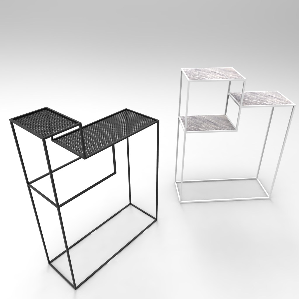 Petite console noir mat en acier, deux étages avec de la tôle perforées carrées ou de la feuille de pierre. Idéal dans une entrée.