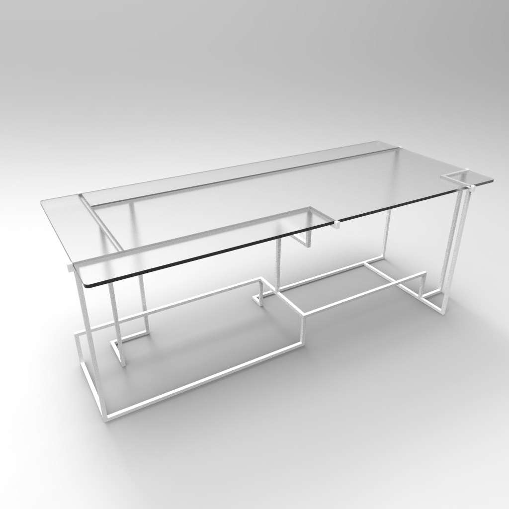 Table en acier et avec son plateau verre trempé dépolie à l’acide et angles arrondis. Son piètement entièrement réaliser sur-mesure est une pièce unique aux allures d’un labyrinthe de barres d’acier carré.