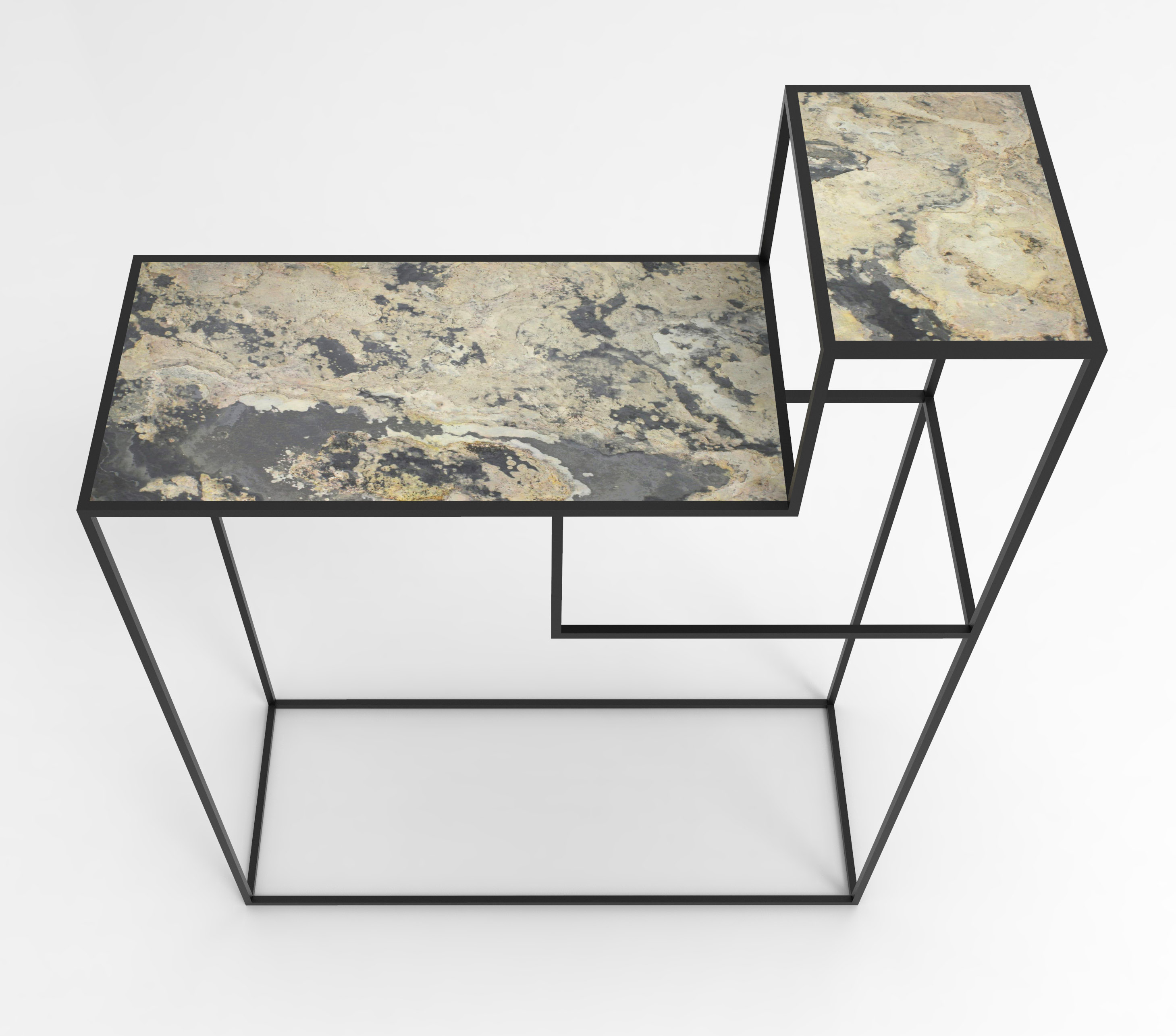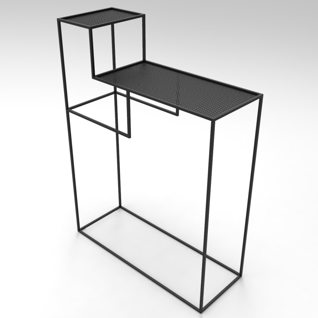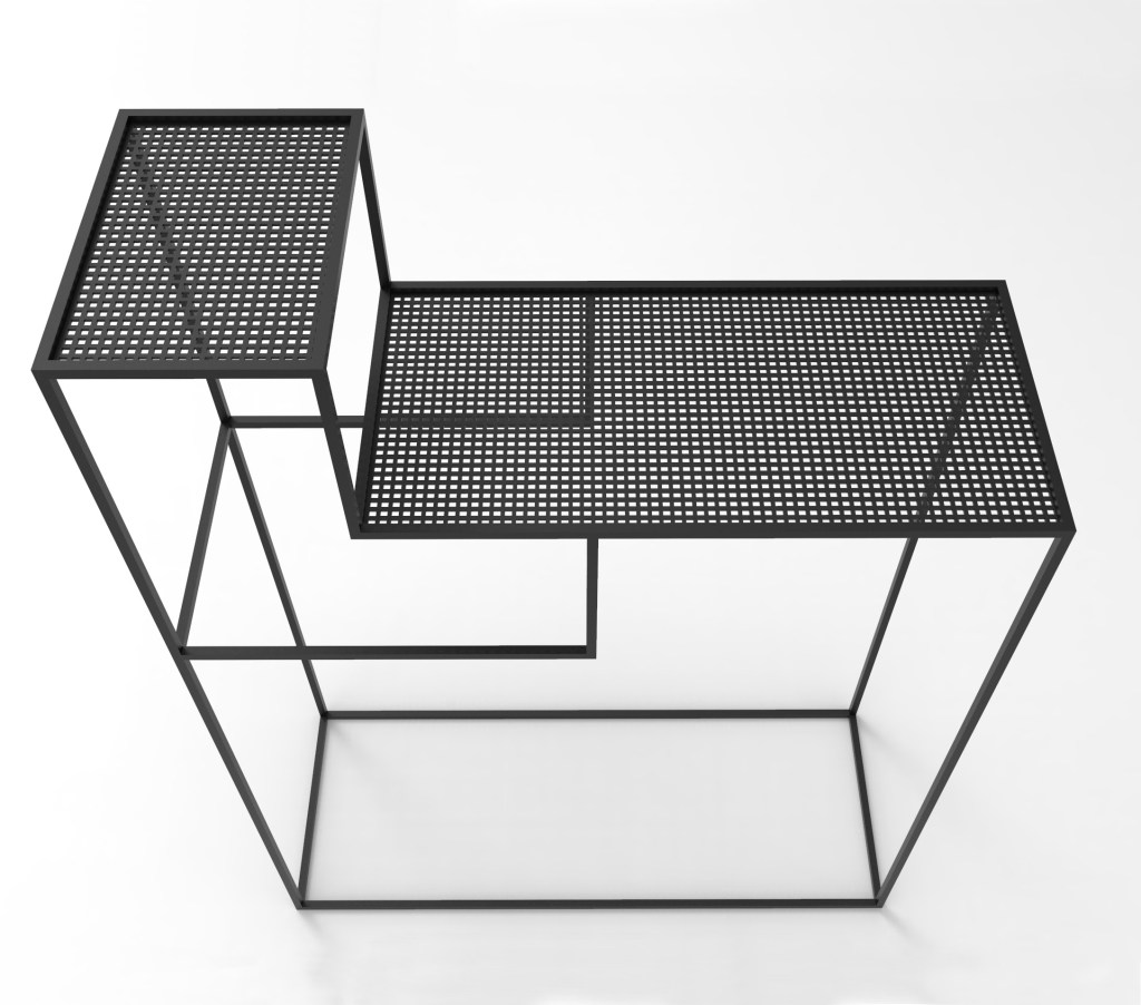 Petite console noir mat en acier, deux étages avec de la tôle perforées carrées ou de la feuille de pierre. Idéal dans une entrée.