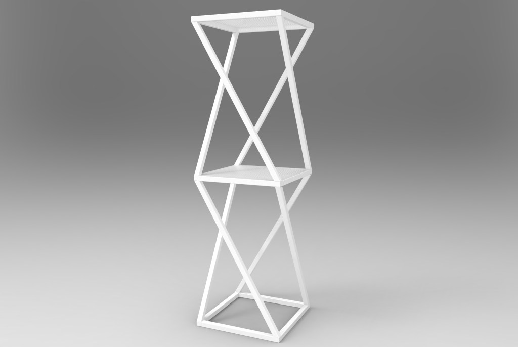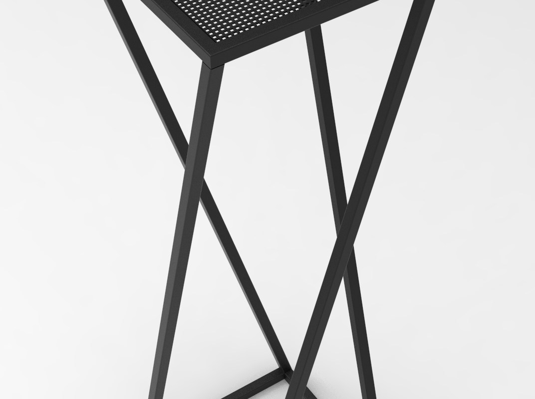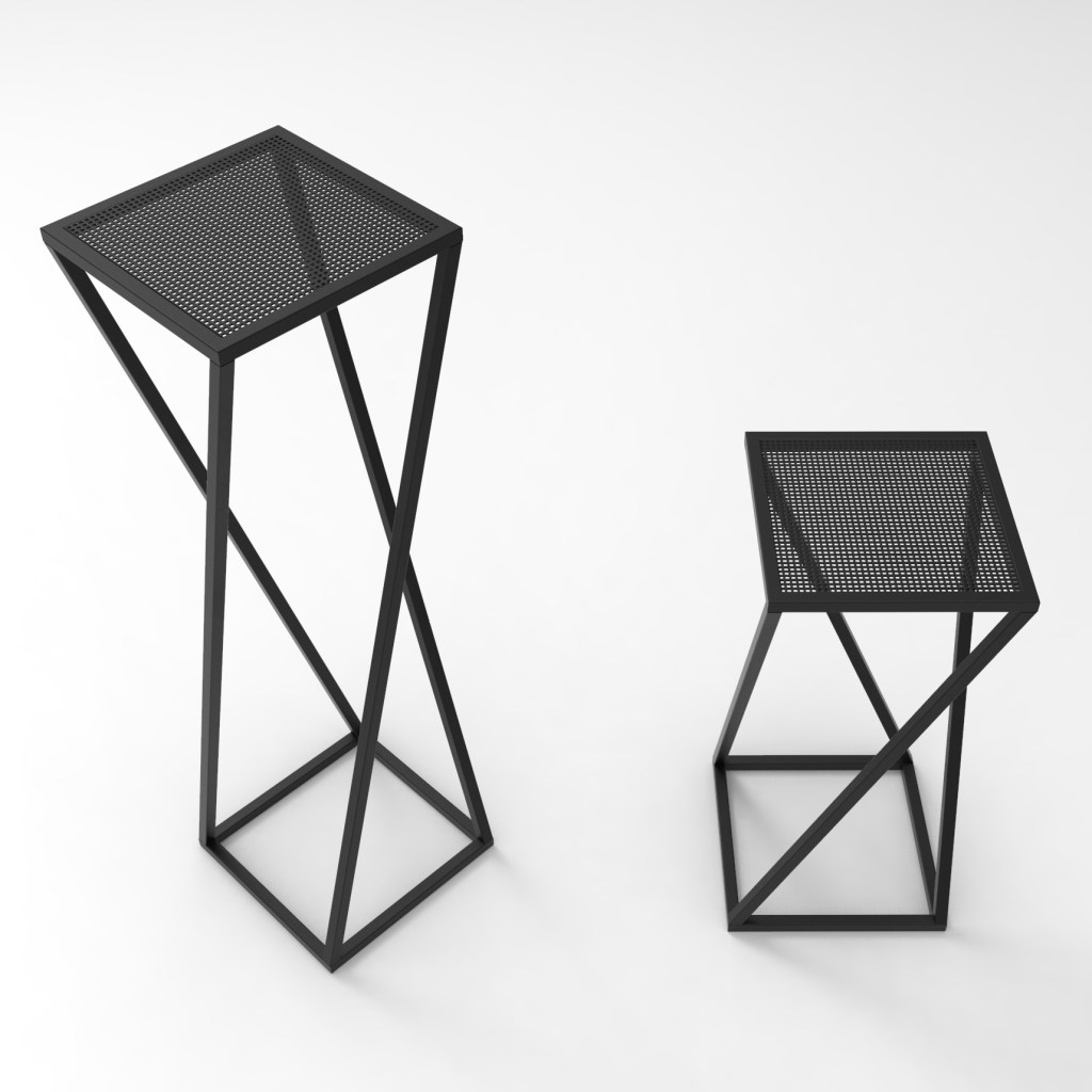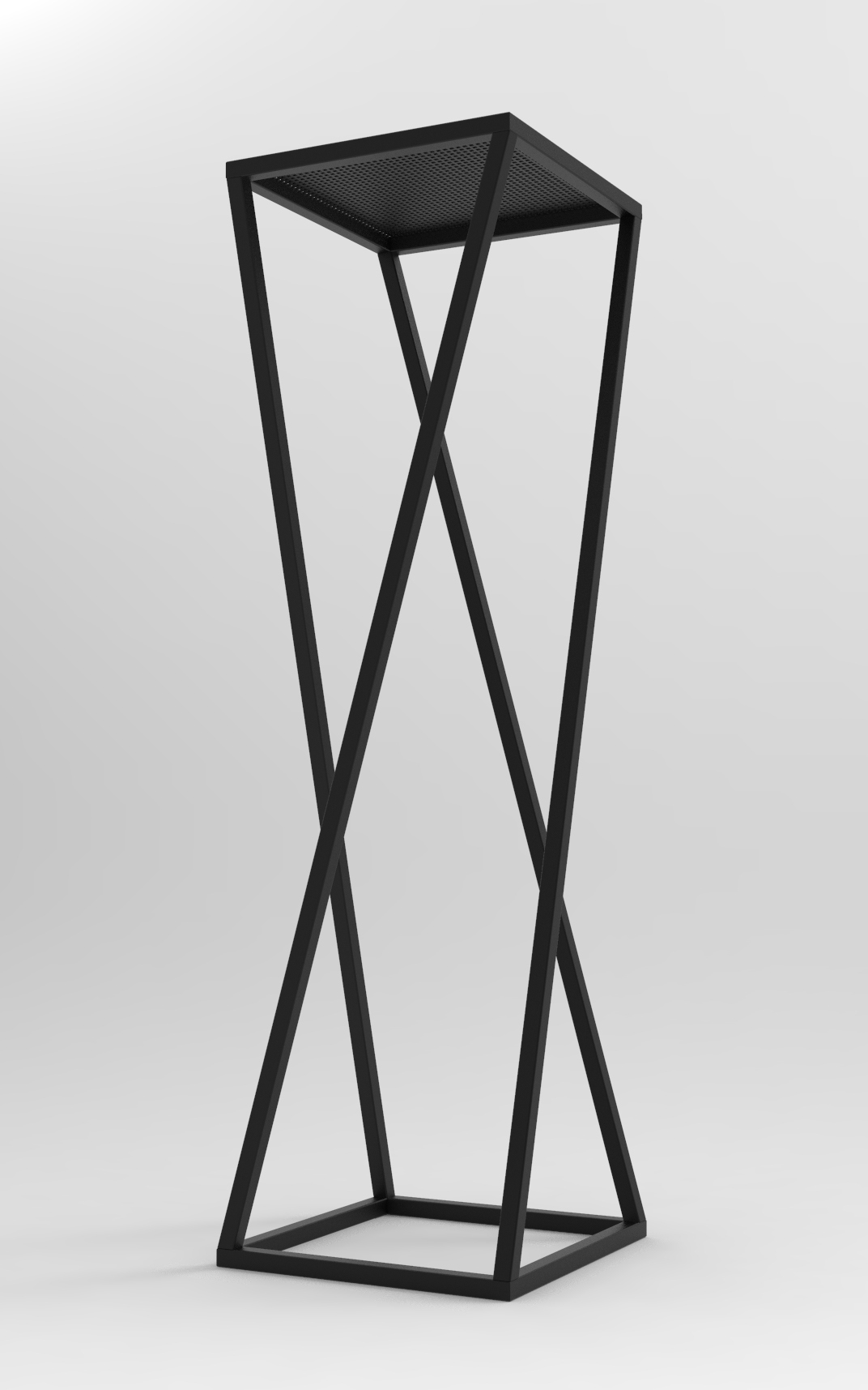Socle ou porte-plantes, en tube carré 20 mm et une tôle perforée carré le tout en acier, avec une peinture en thermolaquage mat.